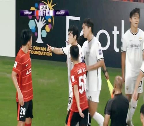 从比赛开始,客场作战的江原FC就展开了积极的前场逼抢,而右边路三个人之间的配合很默契,数次突破至底线形成传中。而成都蓉城在对手压迫下,很难组织起有效的进攻,费利佩、罗慕洛拿球的机会都被限制的非常厉害。