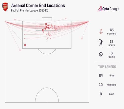 自2023-24赛季开始,阿森纳已经在英超通过角球打进36球,比任何其他球队都至少多15球。除了切尔西(21)、热刺(21)、利物浦(20)和埃弗顿(20),没有其他球队能突破20球。实际上,只有这四队加上西汉姆联(19)能够达到阿森纳的一半角球进球数。