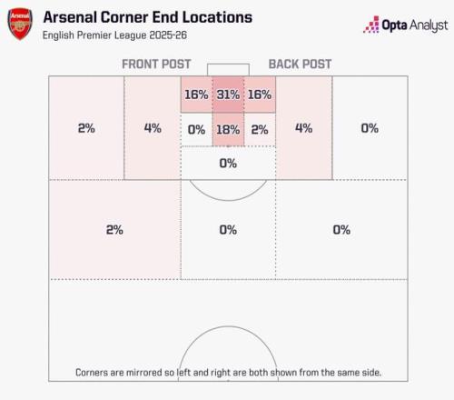 从下图也能看出,他们角球战术多样,有着几乎同样数量的角球选择前点和后点,而将近一半(49%)被送到距离球门12码的中路区域,让高个子球员争抢或者制造混乱。