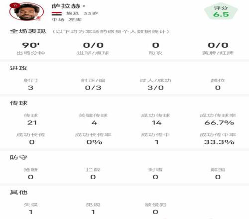 统计显示,萨拉赫本场比赛3次射门,但都未能射正,3次过人也均没有成功。