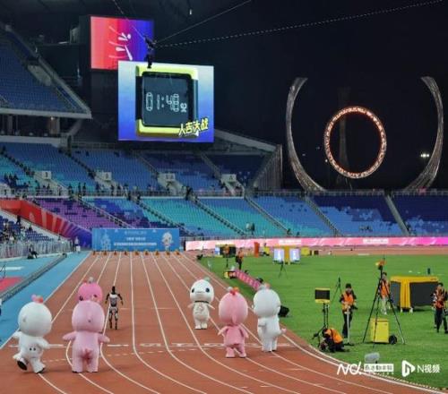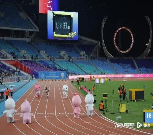 11月17日晚,十五运会田径比赛继续在广东奥体中心进行。当晚将决出男女100米金牌。在此之前,吉祥物和机器人在百米赛道上PK,为比赛暖场。