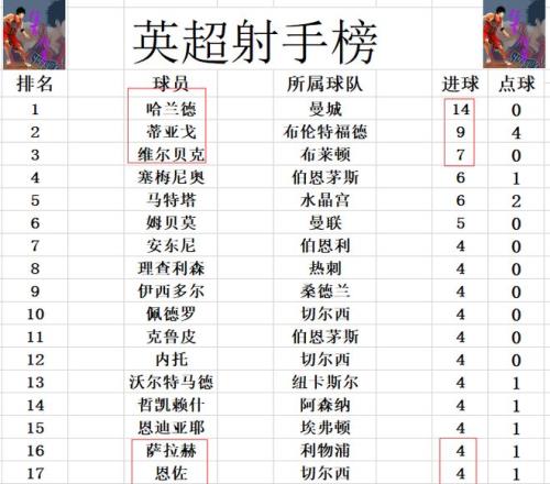 射手榜方面,哈兰德今天错失单刀良机没有进球,还是14球领跑。蒂亚戈打入一球,将和哈兰德的差距缩小到5球,维尔贝克破门,多塞梅尼奥,马特塔1球独居第3。内托,恩佐今天各入一球,追上萨拉赫,哲凯赖什等人4球刚好挤入前十。