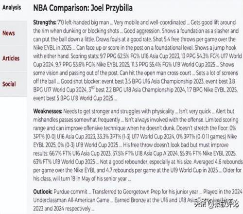 在2025年耐克EYBL中场均4.6个篮板,在2025年U19世界杯中场均4.7个篮板,在他的年级中年龄偏大,将在高四那年的5月份年满19岁。