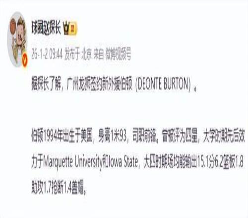 广州男篮本赛季的表现中规中矩,前七场比赛中,主帅米切尔率队取得3胜4负的成绩暂列联赛第十六名。由于核心后卫郭艾伦只打了两场比赛又伤停,广州男篮后场压力都给到了外援威金顿,为了进一步提升后防线的攻防实力,广州男篮迅速敲定了第四外援人选。据媒体人“球圈赵探长”最新报道:“广州龙狮签约新外援伯顿。”从比赛集锦来看,伯顿是一名身体素质非常劲爆,且技术打法非常全面的前锋,相信他的加入能够很大程度提升广州男篮的综合实力。