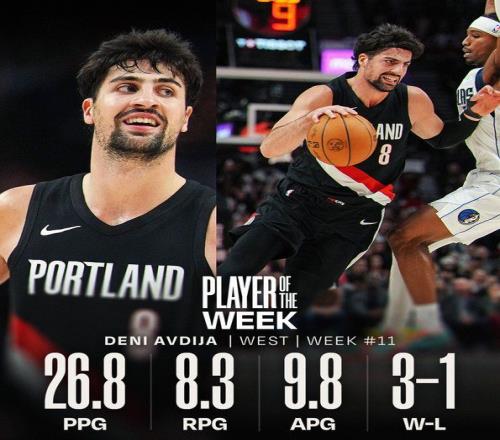 上周,阿夫迪亚率领开拓者队取得3胜1负的战绩,场均贡献26.8分、9.8个篮板、8.3次助攻。他也是自2023年2月7日利拉德之后,首位获此殊荣的开拓者队球员。
