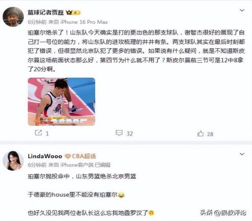 篮球记者“贾磊”发文点评:“珀塞尔绝杀了!山东队今天确实是打的更出色的那支球队,谢智杰很好的展现了自己打一号位的能力,将山东队的进攻梳理的井井有条。两支球队其实在最后时刻都犯了错误,但很显然北京队犯了更多的错误。如果说有什么疑问,就是不知道斯皮尔曼这场前面状态那么好,第四节为什么就不用了?斯皮尔曼前三节可是12中8拿了20分啊。”