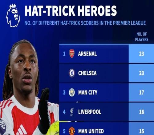 英超历史戴帽球员数量前10球队:阿森纳、切尔西23人居首
